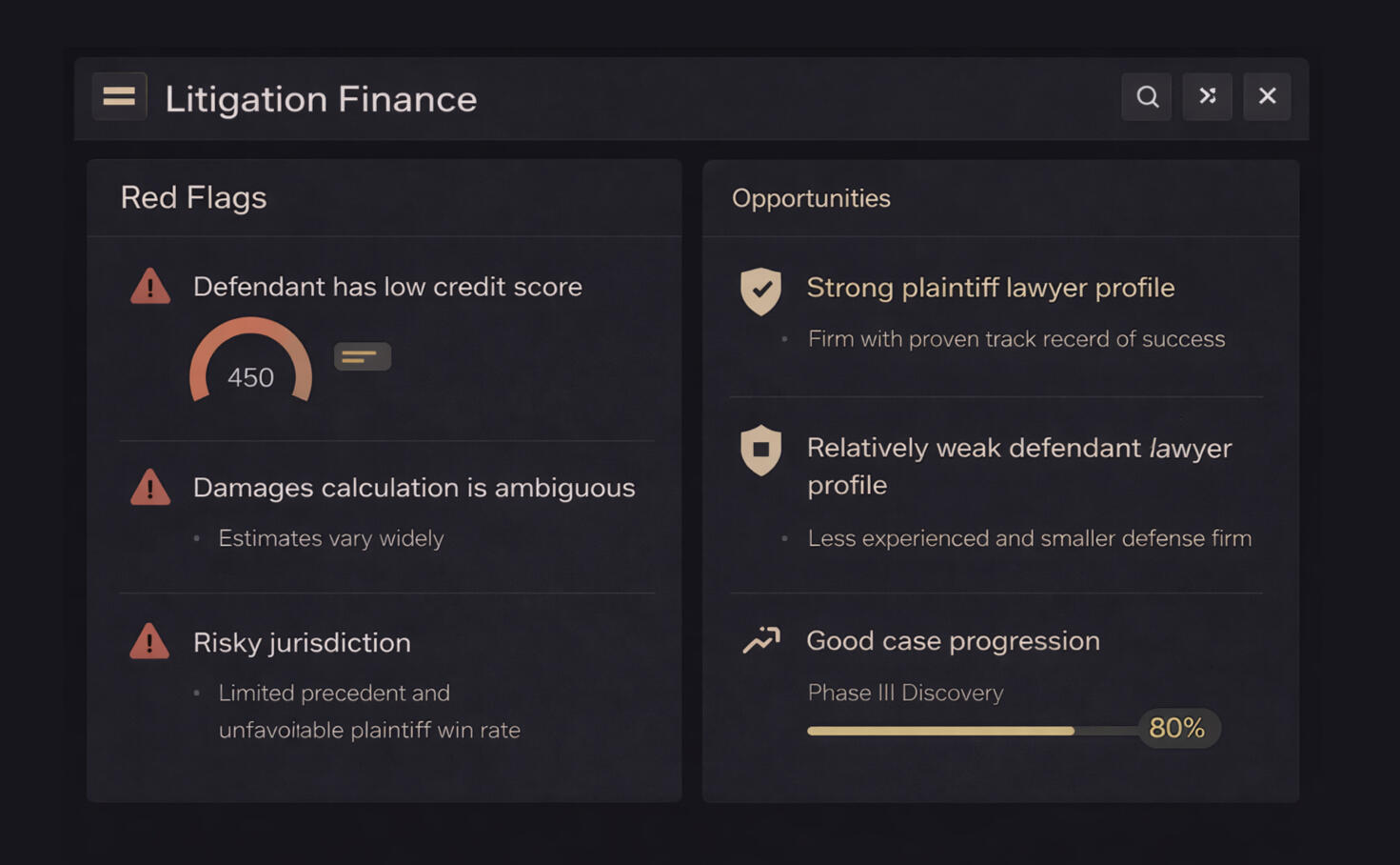 Automate 60–70% of manual case intake and litigation underwriting effort. The OS for litigation funders.
